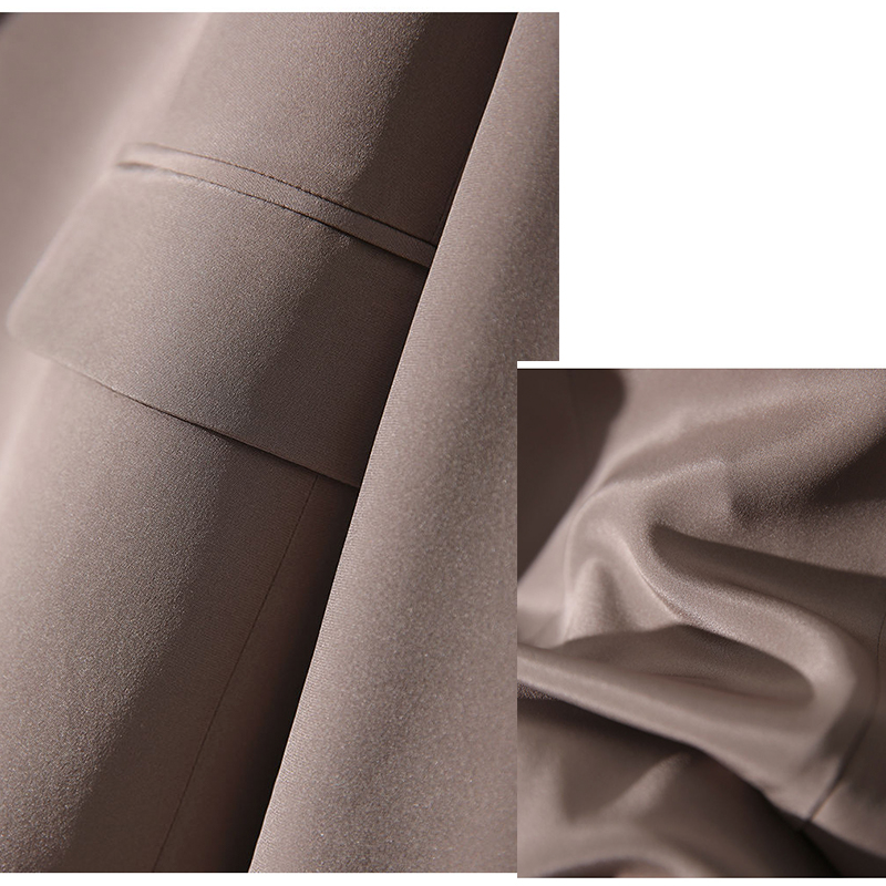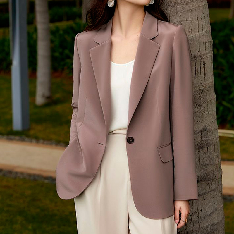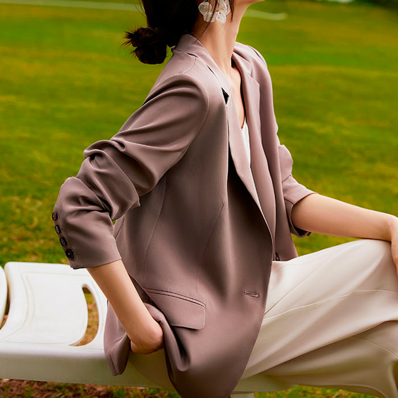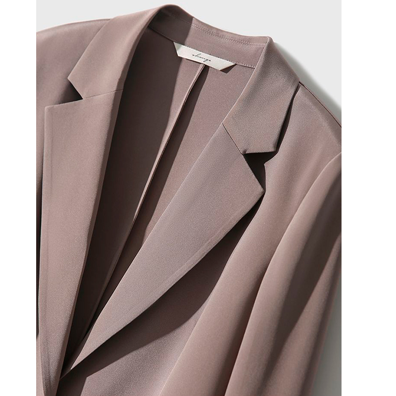 Ատլասե բարակ թեթև արևմտյան բարձրակարգ ոճի բաճկոն գարուն աշուն մեկ կոճակով երկու կողմում ծալովի գրպաններ հետևի ծայրին կտրվածք։