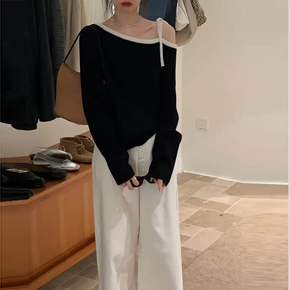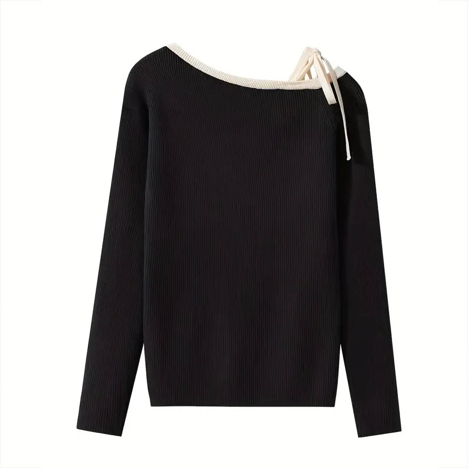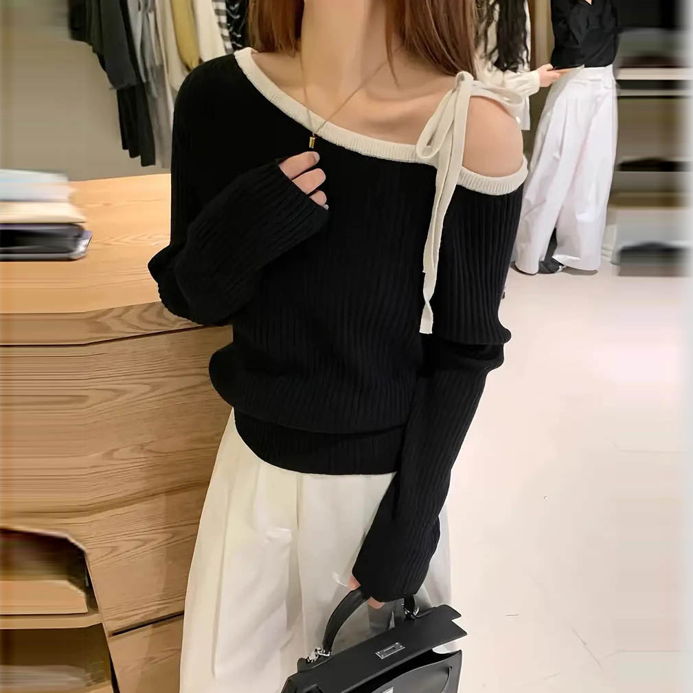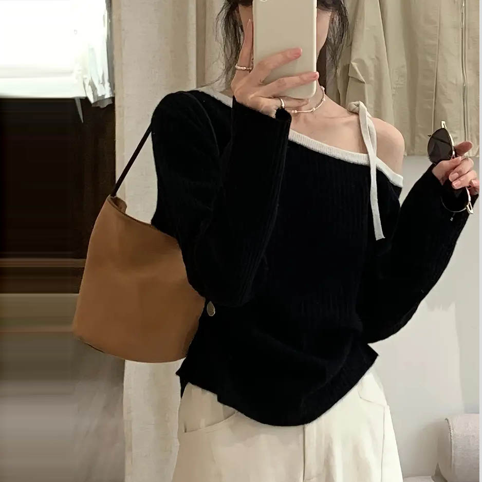 Աշնանային ձմեռային, բաց ուսով երկարաթև վերնաշապիկ տարբերակը ժանյակով մինչև շեղանկյուն դեկոլտեով տրիկոտաժե հագուստ