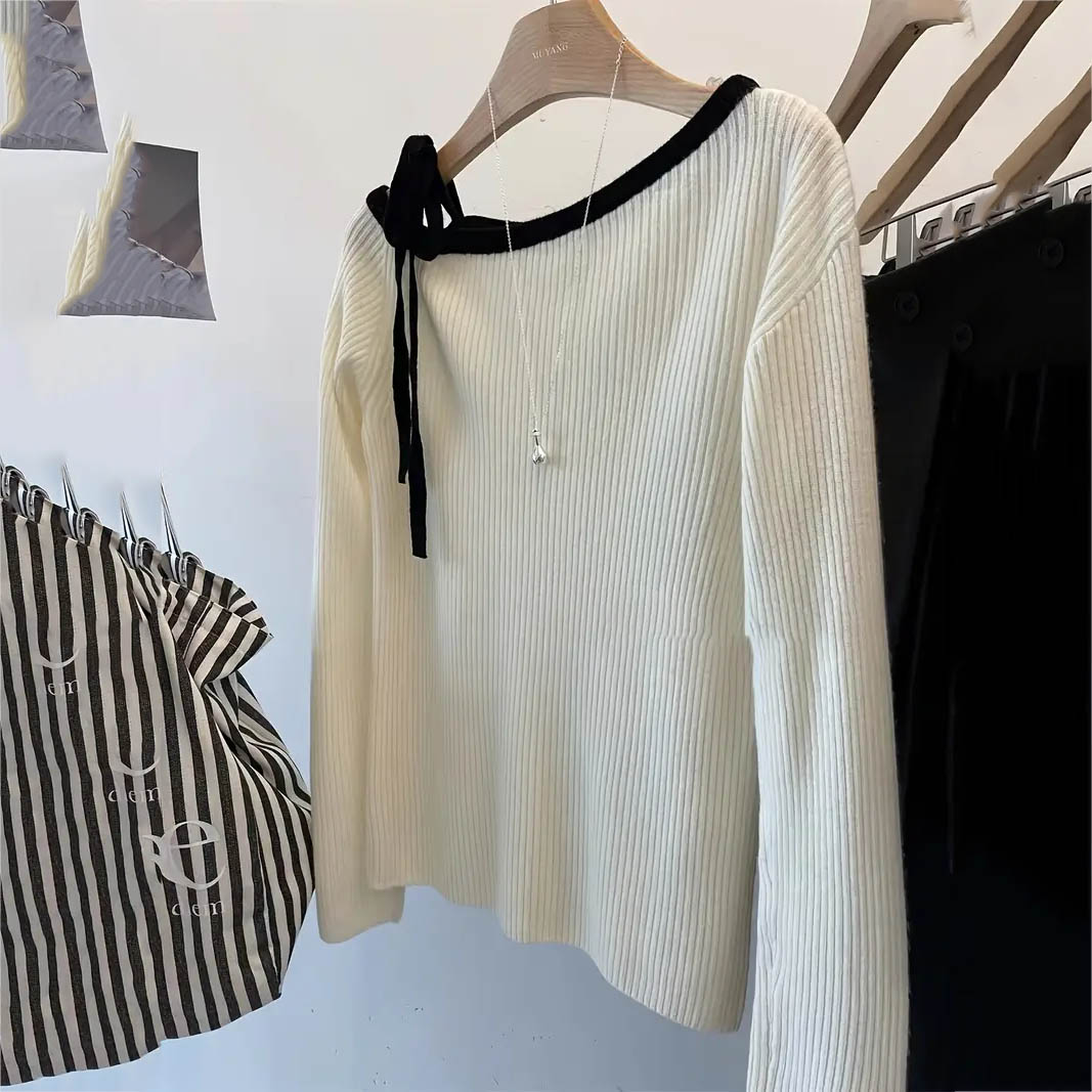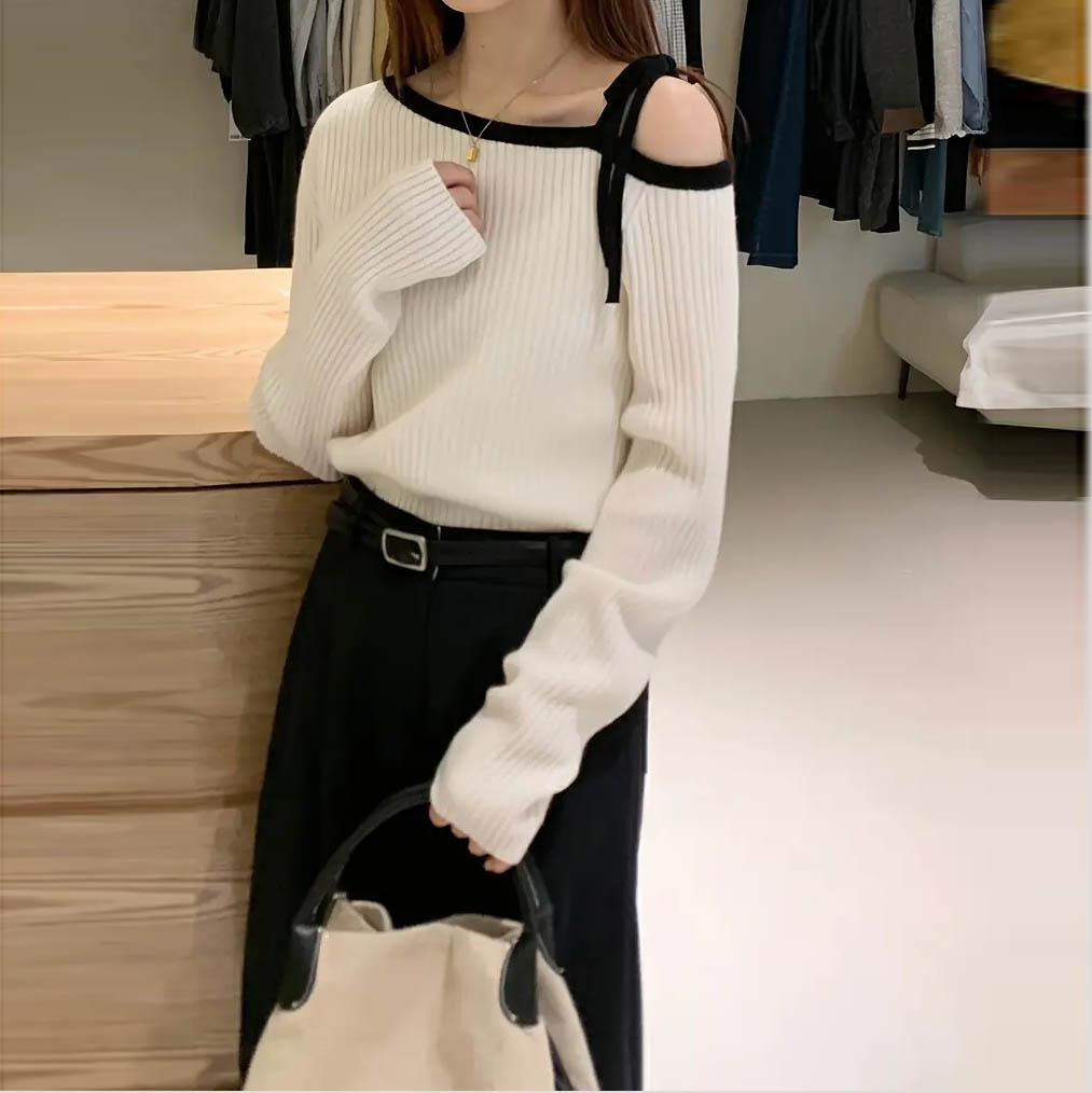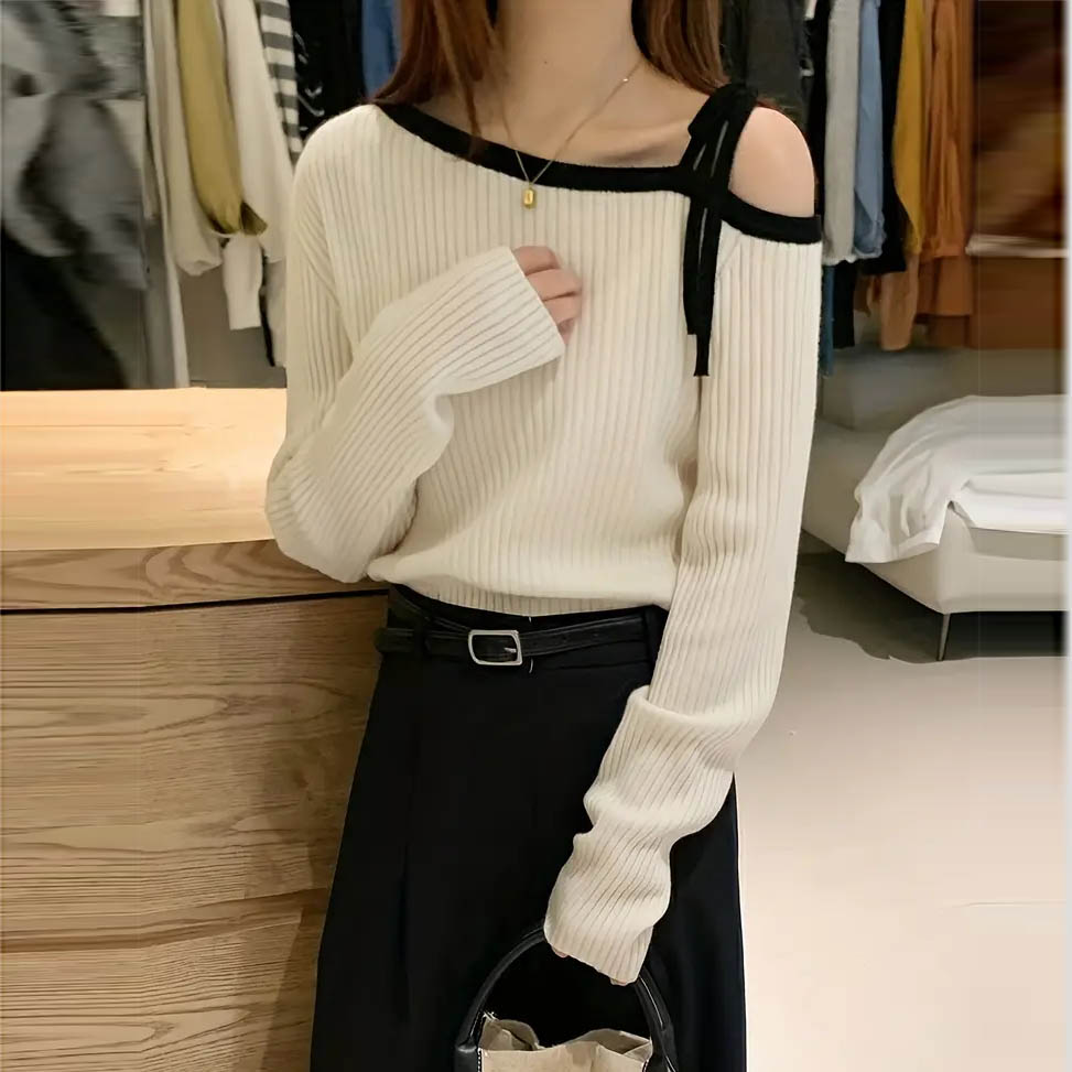 Աշնանային ձմեռային, բաց ուսով երկարաթև վերնաշապիկ տարբերակը ժանյակով մինչև շեղանկյուն դեկոլտեով տրիկոտաժե հագուստ