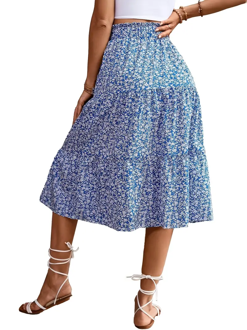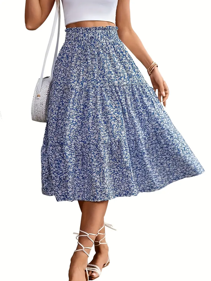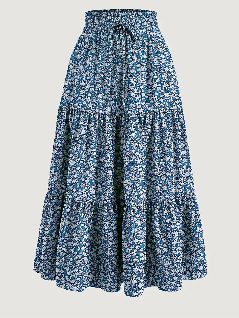 1 հատ Բոհեմյան ոճի էլեգանտ կասկադ կիսաշրջազգեստ Կապույտ Ditsy ծաղկային A-Line Midi կիսաշրջազգեստ PP Lace Up կիսաշրջազգեստ բոլոր սեզոնների համար