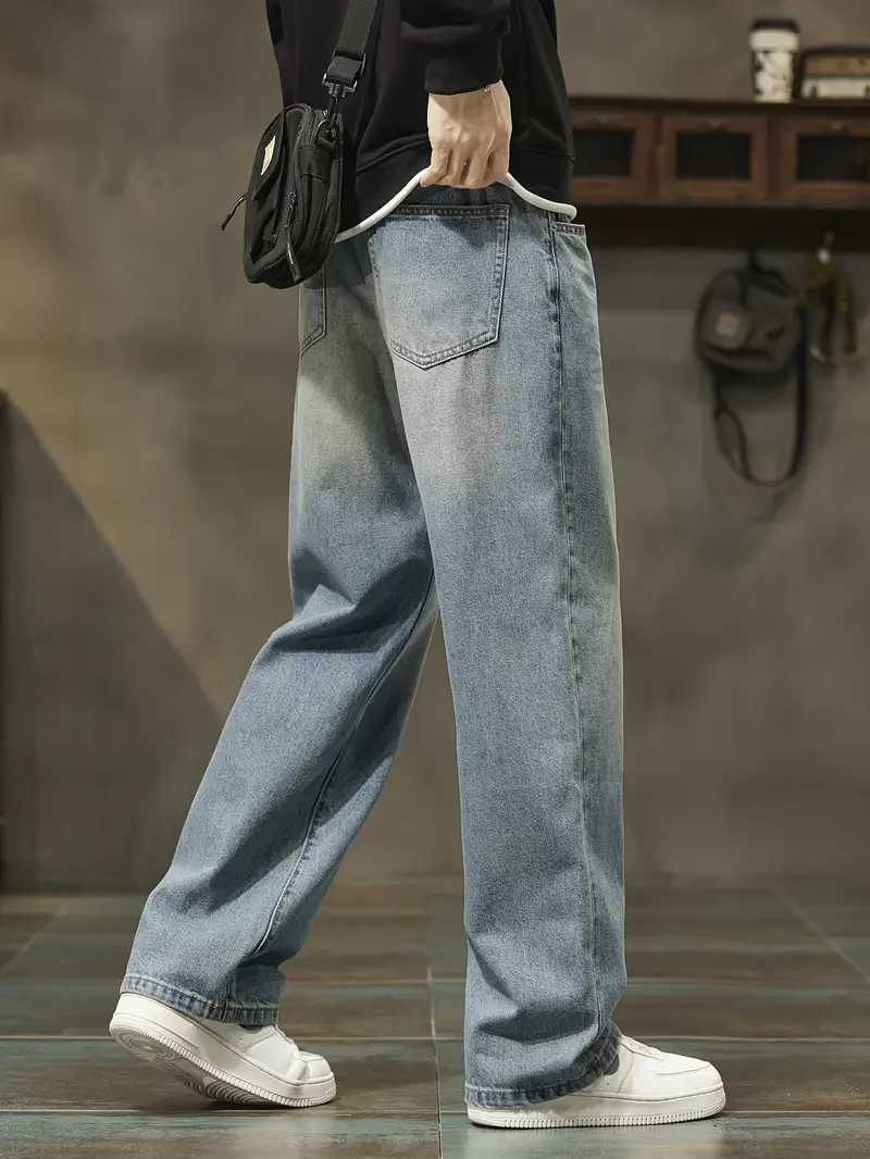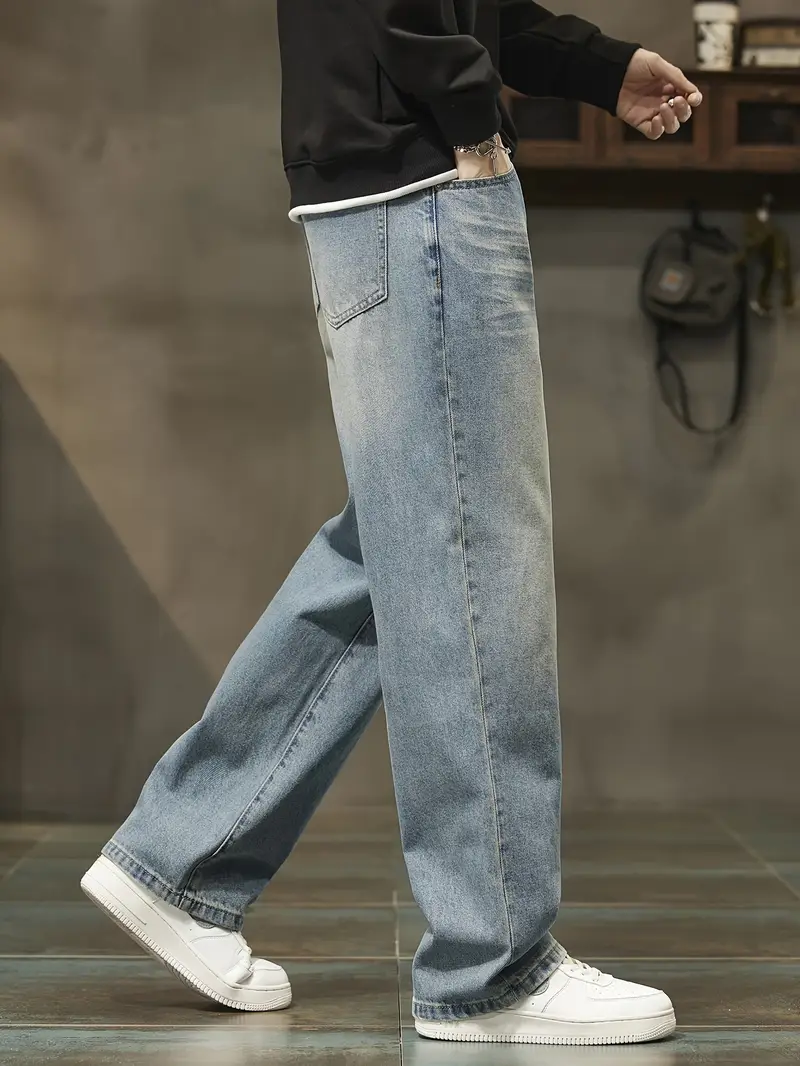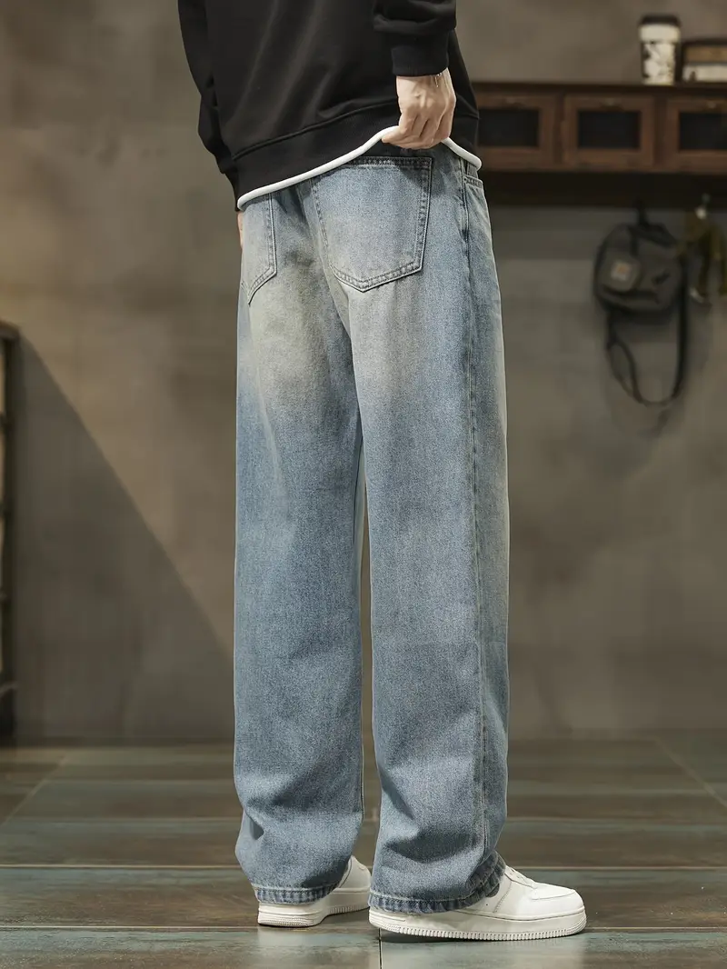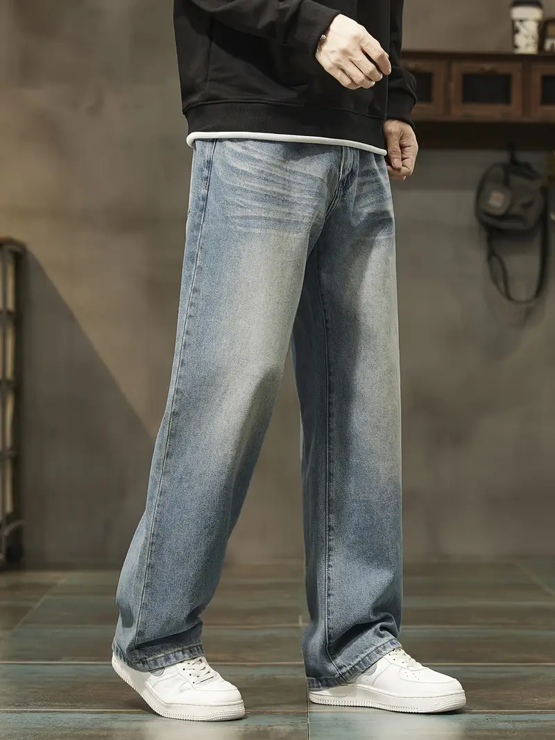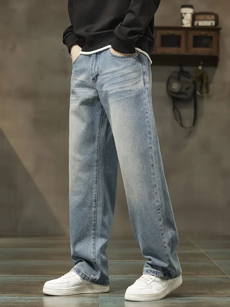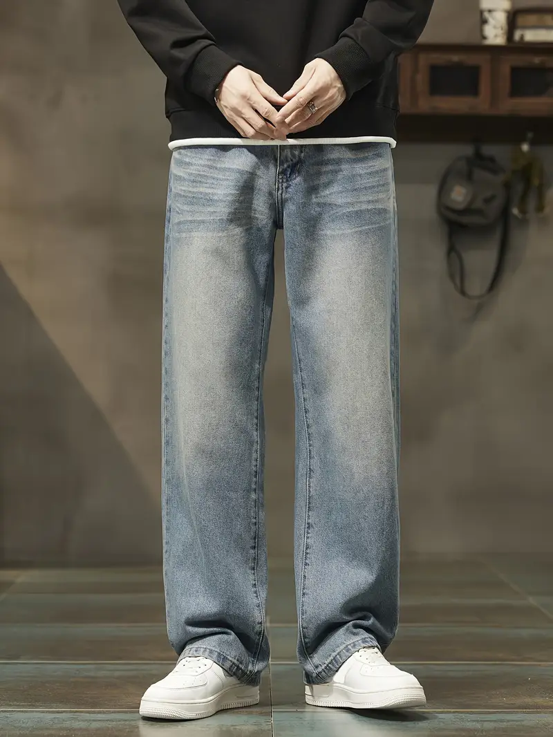 Տղամարդկանց փողոցային ոճի ազատ ուղիղ ջինսեր, էֆեկտով, չձգվող բամբակյա խառնուրդ, գոտկատեղը միջին մասում, կայծակաճարմանդով, գարուն/աշուն ամենօրյա կրելու համար: