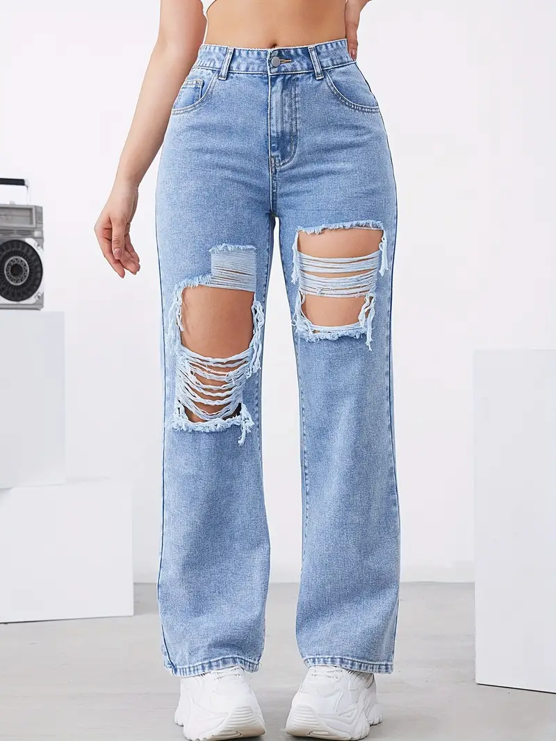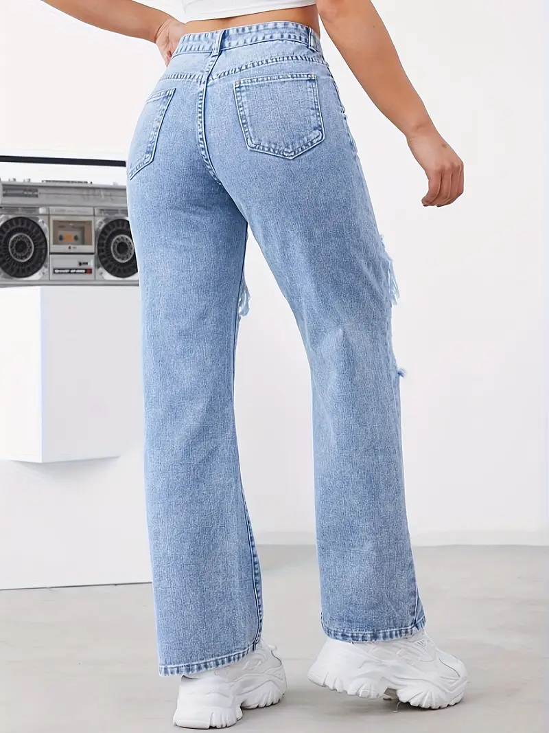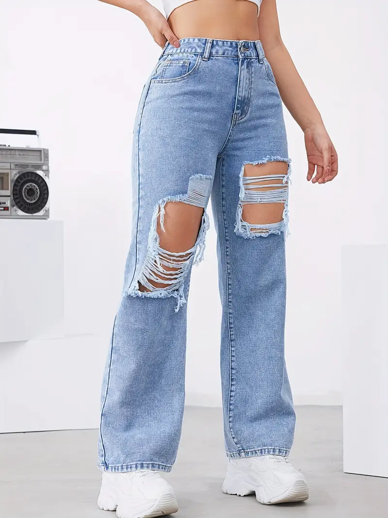 Կանացի պատռվածքով ջինս բարձր գոտկատեղով, լայն ոտքով, դետալներով, չձգվող, լվացվող մեքենայով