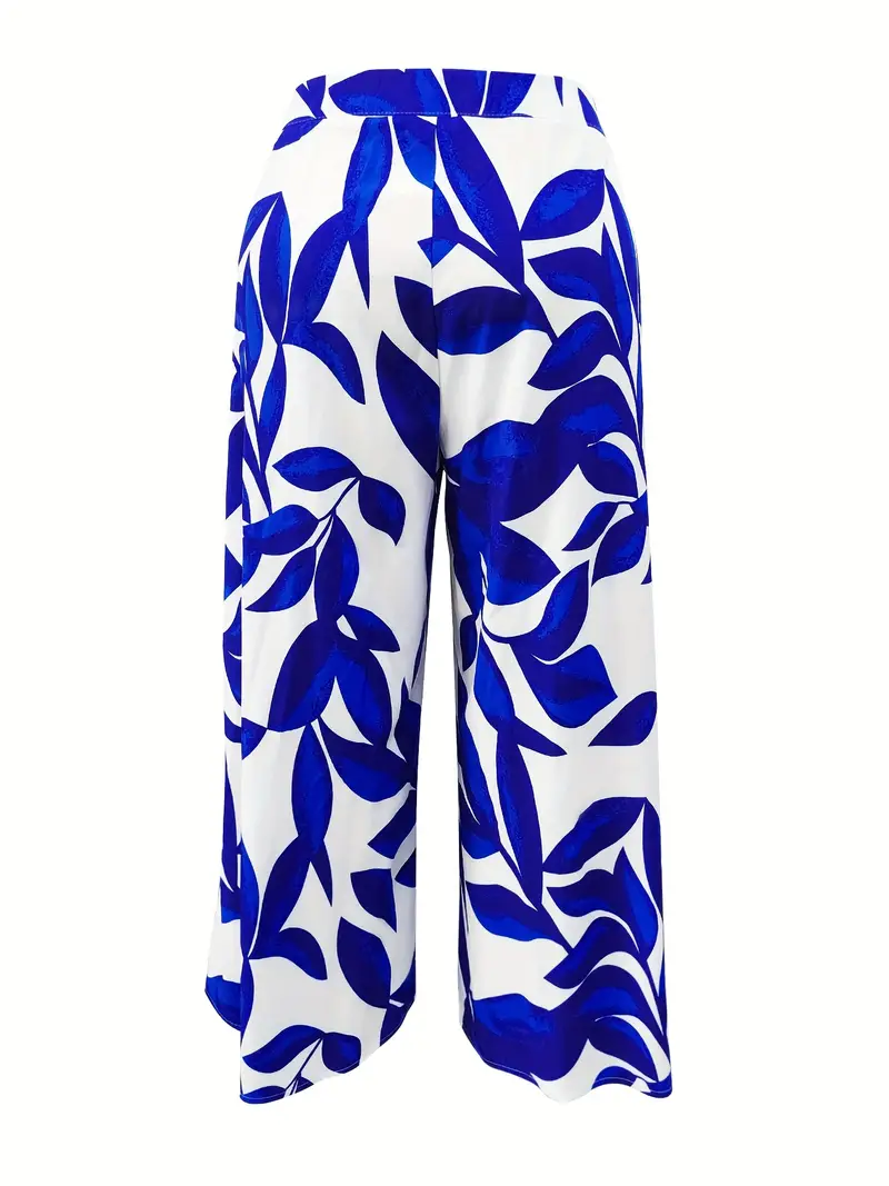 Plus Size Tropical Print Լայն ոտքի տաբատ՝ բարձր գոտկատեղով, հանգիստ տեղավորմամբ, պոլիեսթեր, լվացվող մեքենայով՝ կատարյալ արձակուրդի համար