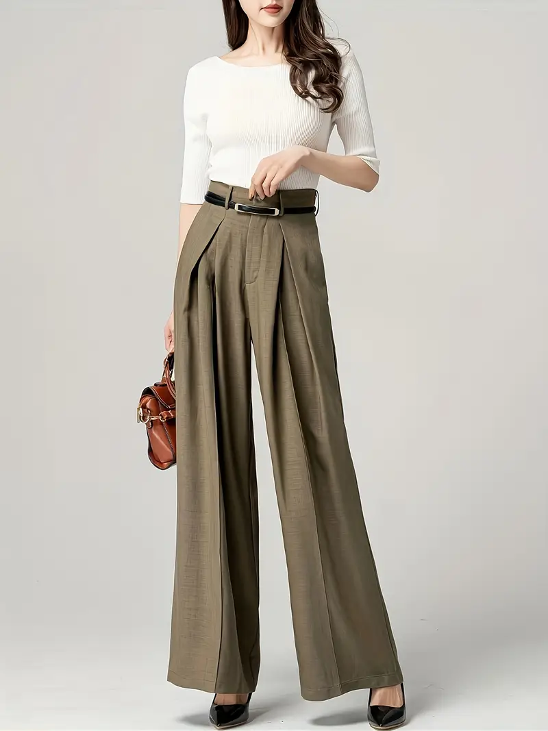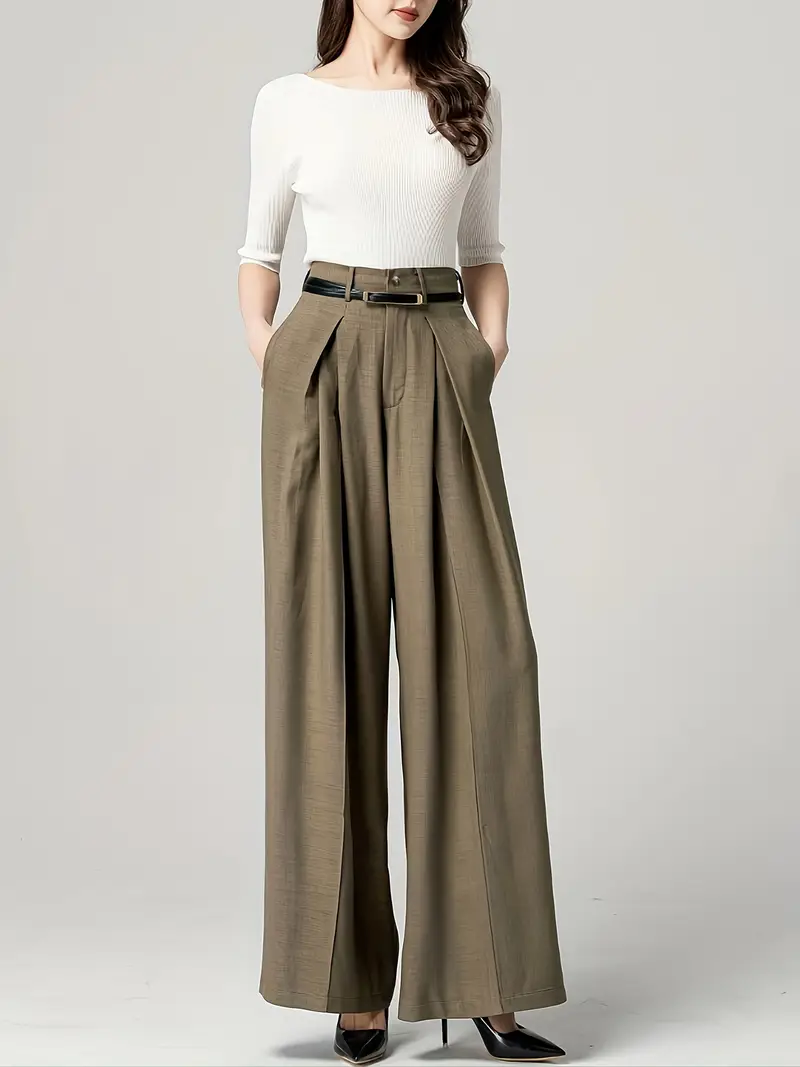 Պարզ բարձր իրան լայն ոտքերի տաբատ նրբագեղ ծալքավոր տաբատ՝ գրպաններով գրասենյակային և աշխատանքային կանացի հագուստ: