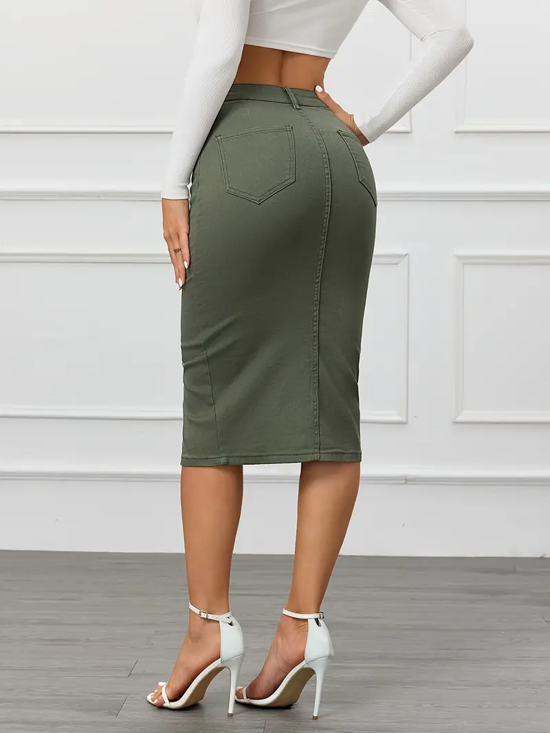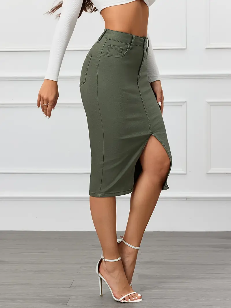 Կանացի բարձր գոտկատեղից ձգվող ջինսե միդի կիսաշրջազգեստ՝ բացվածքով՝ ձիթապտղի կանաչ գույնի, բոդիկոնի պիտանի, բազմակողմանի փողոցային ոճ, լվացվող մեքենայում