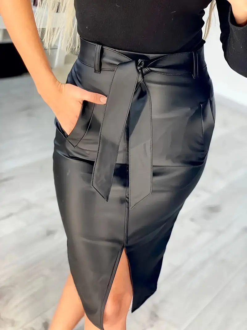 Կանացի էլեգանտ բարձր գոտկատեղից արհեստական կաշվից միդի կիսաշրջազգեստ՝ կողային ճեղքվածքով և փողկապի դետալներով - հեշտ լվացվող պոլիեսթեր խառնուրդ, լվացվող մեքենայում՝ կատարյալ բոլոր սեզոնների համար