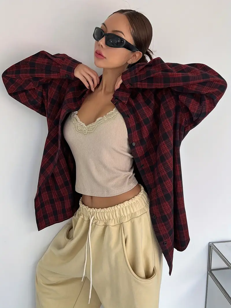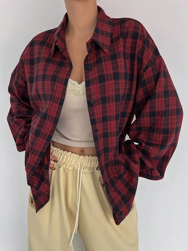 Կանացի վանդակավոր վերնաշապիկ՝ 100% պոլիեսթեր օձիքով հյուսված վերնաշապիկ գարուն/աշուն - նորաձևություն մեծահասակների համար