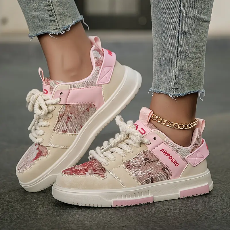 Կանանց նորաձևություն տպագրությունով սպորտային կոշիկներ։ Հարմարավետ կլոր ժանյակավոր կոշիկ, թեթև EVA ներբանով և գործվածքից վերնամասով բազմակողմանի կոշիկներ բոլոր եղանակների համար