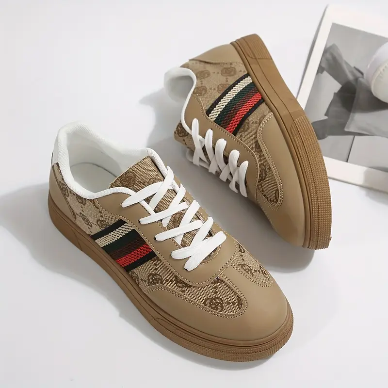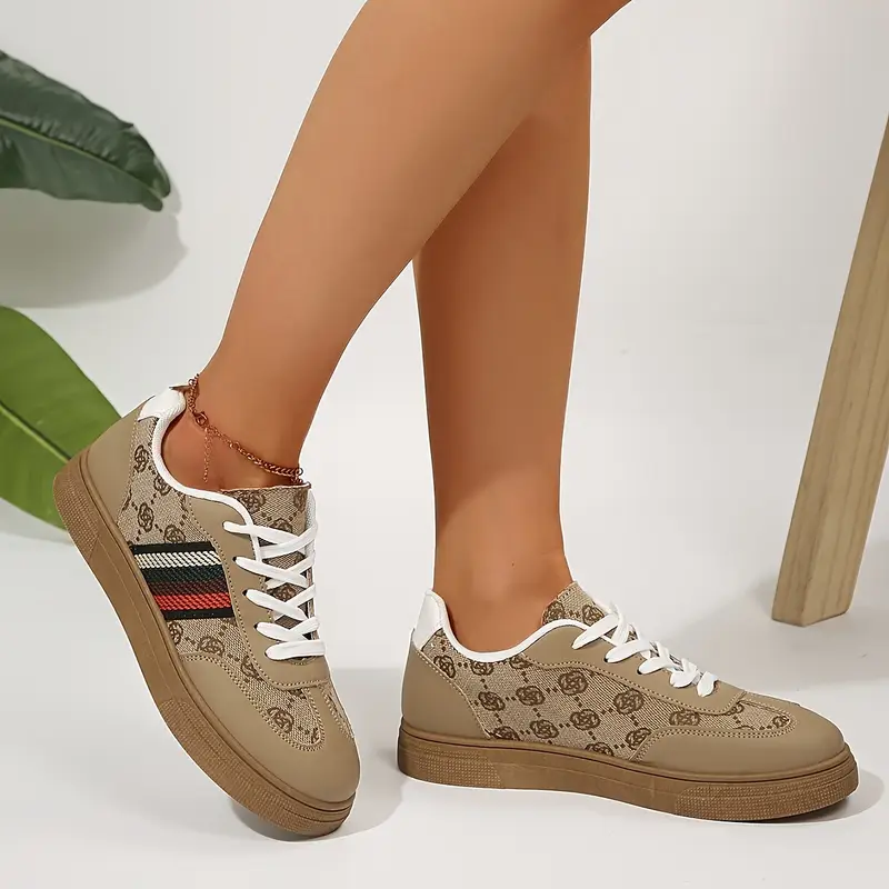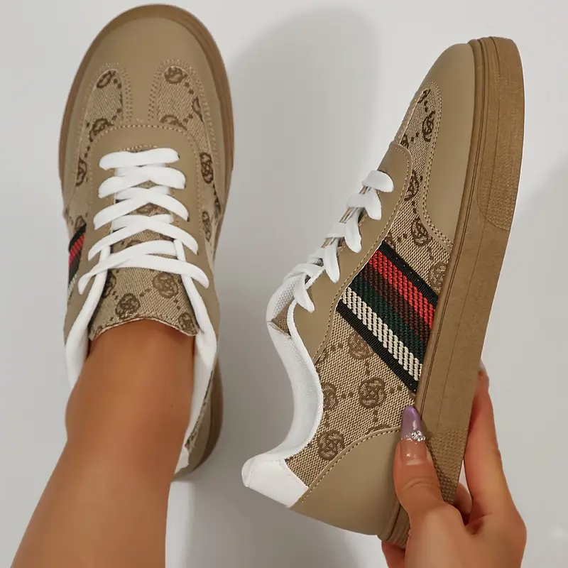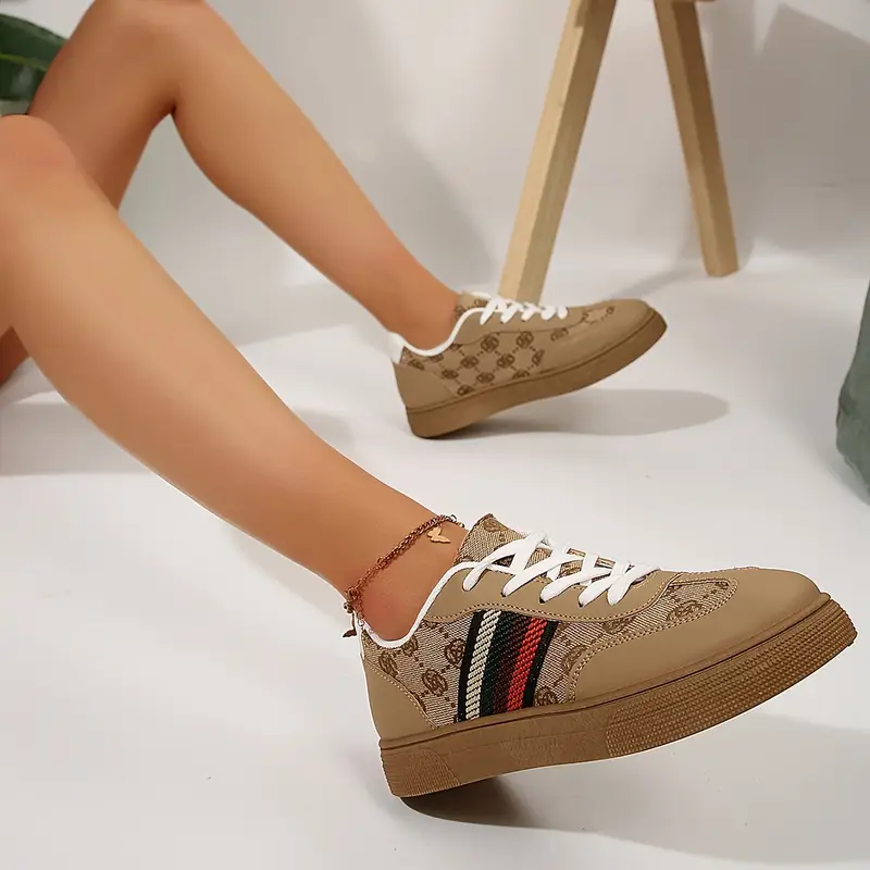 Կանացի շնչող ցածր Lace Up սպորտային կոշիկներ բեժ սպիտակ լոգոյով և գծերով, ռետինե տակացույով, հարմարավետ ամենօրյա սպորտային կոշիկներ բոլոր եղանակների համար