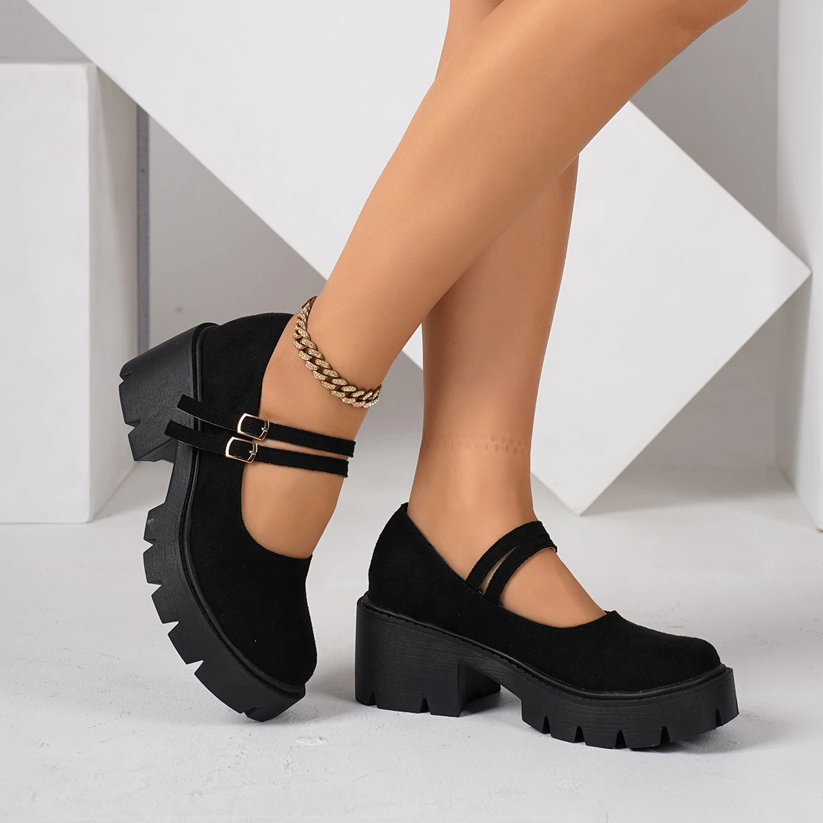 Կանացի սև ժապավենով բարձրակրունկ կոշիկներ։ Հարմարավետ կլոր դիմացի մաս հաստ ներբան Արհեստական երեսպատում, ռետինե արտաքին ներբան։ Կատարյալ ամենօրյա կամ ոճային երեկույթների նորաձև կոշիկներ։ Երկարակյաց և չմաշվող
