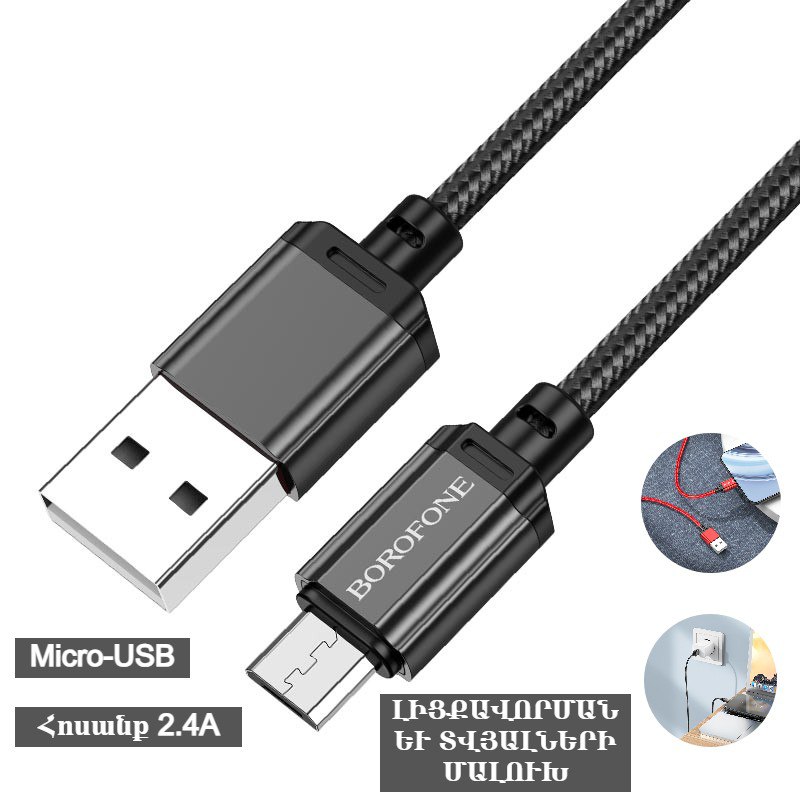 BOROFONE BX87 լիցքավորման և տվյալների մալուխ Micro-USB սարքերի համար, 1մ, հոսանք մինչև 2.4A, նեյլոնե հյուս 1. Երկարությունը՝ 1 մ, քաշը՝ 24 գ 2. TPE + նեյլոնե հյուս։ 3. Լիցքավորման և տվյալների փոխանցման աջակցություն, առավելագույն հոսանքը մինչև 2.4A: Մալուխը օգտագործվում է գաջեթը համակարգչի USB պորտին կամ լիցքավորիչին միացնելու համար՝ մարտկոցը լիցքավորելու կամ սարքը համաժամացնելու համար: Borofone BX87-ը մալուխ է բոլոր սարքերը լիցքավորելու համար Micro միակցիչով նեյլոնե հյուսով, որն ապահովում է երկարակեցություն և մաշվածության դիմադրություն: Այս մալուխը ունի 1 մետր երկարություն և ապահովում է սարքի արագ լիցքավորումը։ Մալուխը մի ծայրում ունի Micro միակցիչ, իսկ մյուս ծայրում՝ USB միակցիչ, որը թույլ է տալիս այն միացնել համակարգչին կամ լիցքավորիչին: Նեյլոնե հյուսը ոչ միայն պաշտպանում է մալուխը վնասից, այլև այն ավելի դիմացկուն է դարձնում թեքությունների և թեքությունների նկատմամբ: Borofone BX87 մալուխը ապահովում է սարքի արագ և արդյունավետ լիցքավորումը, ինչպես նաև թույլ է տալիս տվյալներ փոխանցել սմարթֆոնի և համակարգչի միջև։ Այն կարող է օգտագործվել որպես օրիգինալ մալուխի փոխարինում և հարմար և հուսալի աքսեսուար է սարքը լիցքավորելու և համաժամացնելու համար: