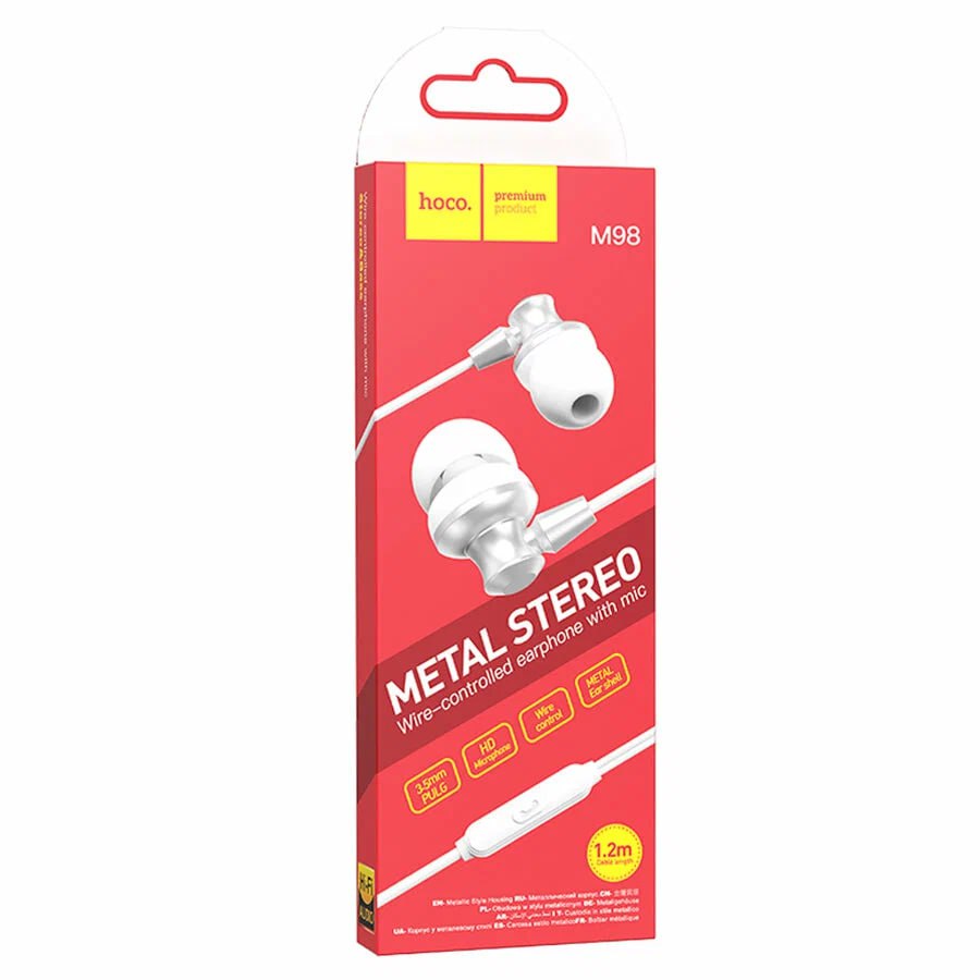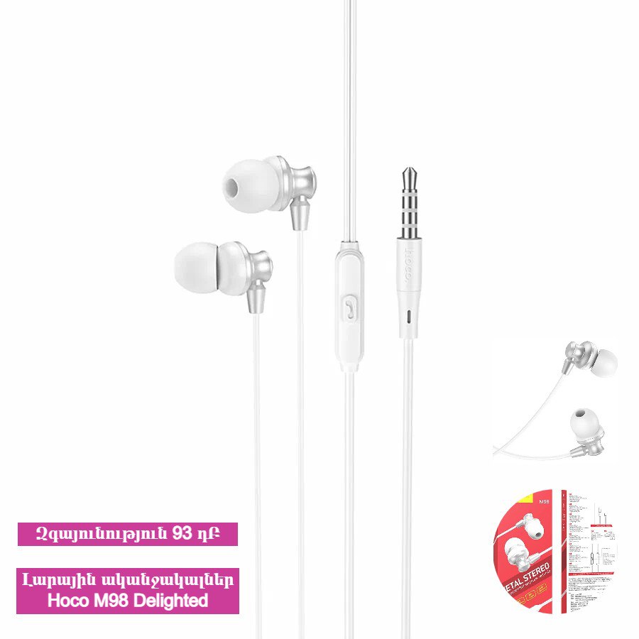 Hoco, Headphones M98 Delighted մետաղական ունիվերսալ ականջակալներ միկրոֆոնով արծաթագույն, 1 հատ. Hoco M98 լարով ականջակալները հարմար են ամենօրյա օգտագործման համար տանը, դրսում և սպորտով զբաղվելիս: Էրգոնոմիկ ձևը թույլ չի տալիս ձեր ականջները երկար ժամանակ հոգնել երաժշտություն լսելուց: Լարային ականջակալները հարմար են 3,5 մմ Mini Jack միակցիչով ցանկացած սարքի համար: 1. Նյութը՝ ABS + TPE էմալային մետաղալար: 2. Բարձրախոս՝ 10 մմ։ 3. Մալուխի երկարությունը՝ 1.2մ; Քաշը՝ 12 գ 4. Աուդիո խցան՝ 3,5 մմ։ 5. Ներկառուցված խոսափող.6. Լարային կառավարում. Մեկ կոճակի ֆունկցիոնալ հսկողություն: