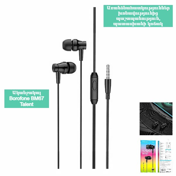 BOROFONE Լարային ականջակալներ BM67 Talent ունիվերսալ ականջակալներ միկրոֆոնով Սև: Borofone BM67 ականջի ստերեո ականջակալներ ներկառուցված խոսափողով և պասիվ աղմուկի նվազեցմամբ: Կառավարվում է մետաղալարի վրա տեղադրված մեկ բազմաֆունկցիոնալ կոճակով: